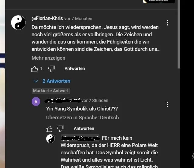 Immer wieder stoßen sich christliche Geschwister daran, das ich christliches Wissen von mir gebe und ein Yin-Yang Symbol als Profilbild nutze. Ich könnte es ändern, aber ich mag es die Menschen zum Nachdenken zu bringen und zu meinen Überzeugungen zu stehen.